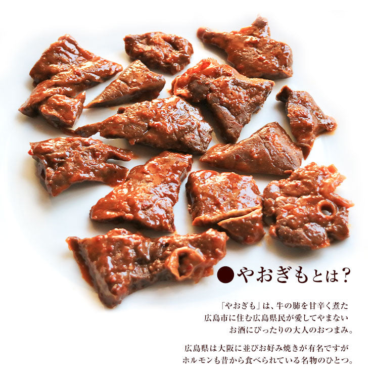 牛やおぎも甘辛煮の紹介・やおぎもとは?「やおぎも」は、牛の肺を甘辛く煮た、広島市に住む広島県民が愛してやまないお酒にぴったりの大人のおつまみ。広島県は大阪に並びお好み焼きが有名ですが、ホルモンも昔から食べられている名物のひとつ。「やおぎも」は、「やわらかい(やおい)」+「肝」という意味の造語で、広島では40年前くらいから食べられている広島名物のホルモン料理です