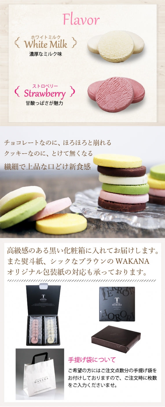 ●ホワイト:クーベルチュールチョコレート(砂糖、ココアバター、全粉乳)、マーガリン、コーンスターチ、粉糖、脱脂粉乳、小麦粉(津山産)、転化糖、本葛粉、乳化剤、香料(一部に小麦、乳成分、大豆を含む)●ストロベリー:砂糖、ココアバター、植物油脂、マーガリン、コーンスターチ、脱脂粉乳、小麦粉(津山産)、全粉乳、苺ソース、本葛粉、転化糖、乳化剤(大豆を含む)、酸味料、着色料(カロテン、クチナシ、紅花)、酸味料、香料(一部に小麦、乳成分、大豆を含む)