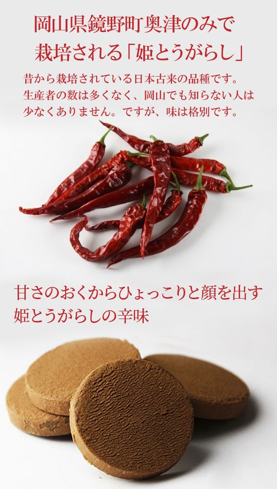 ●姫とうがらし:砂糖、カカオマス、マーガリン、コーンスターチ、脱脂粉乳、小麦(津山産)ココアバター、転化糖、本葛粉、姫唐辛子/乳化剤、香料、クエン酸、着色料(カロテン)(一部に小麦・乳化分・大豆を含む)