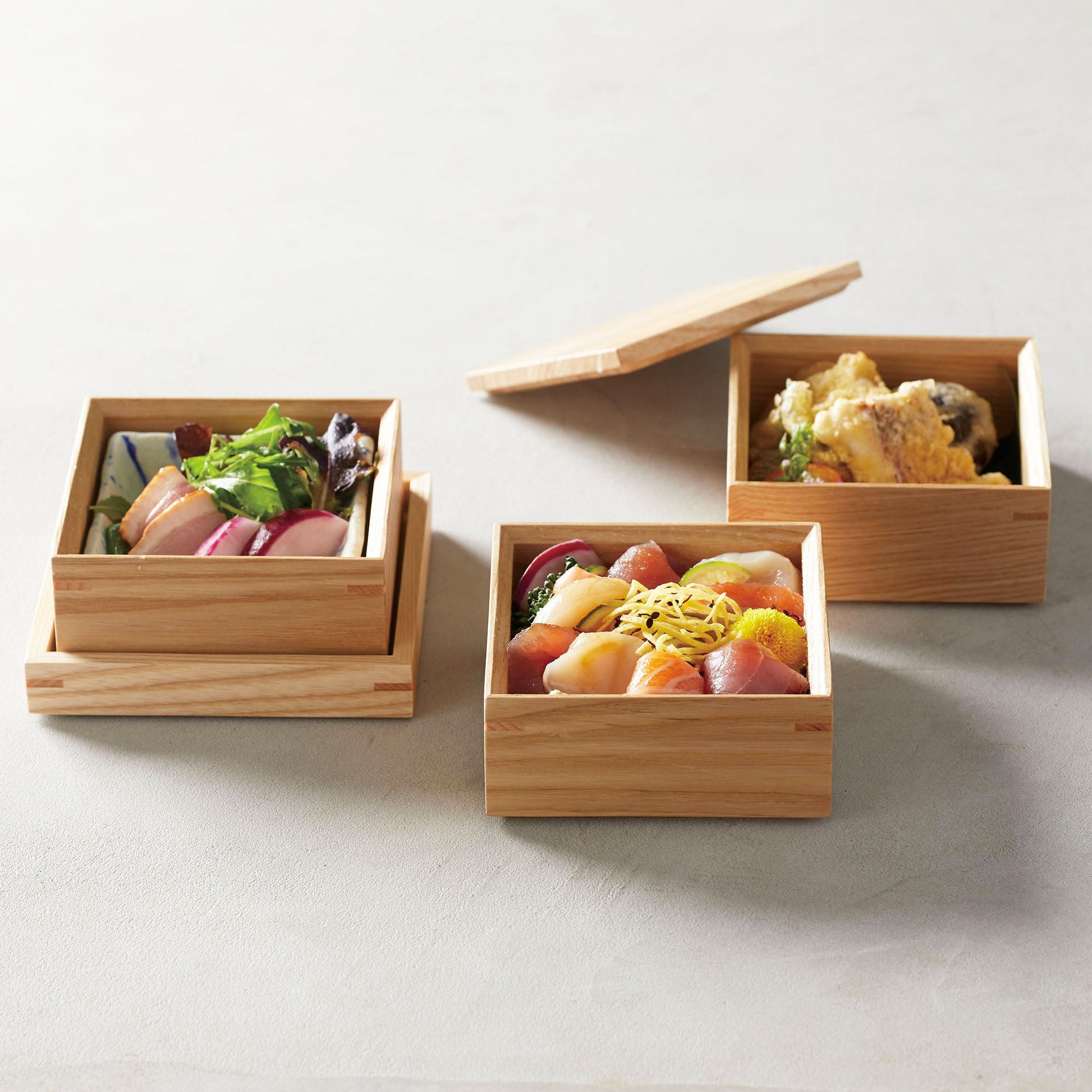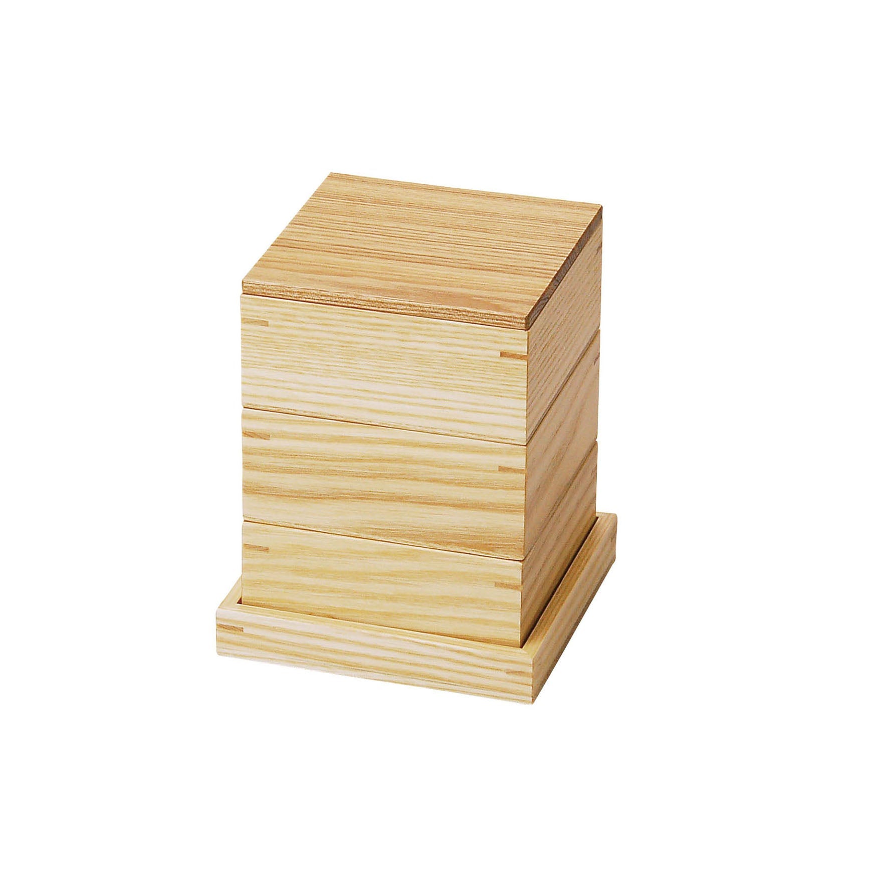 タモ材を使用した、モダンな雰囲気の三段料理箱です。