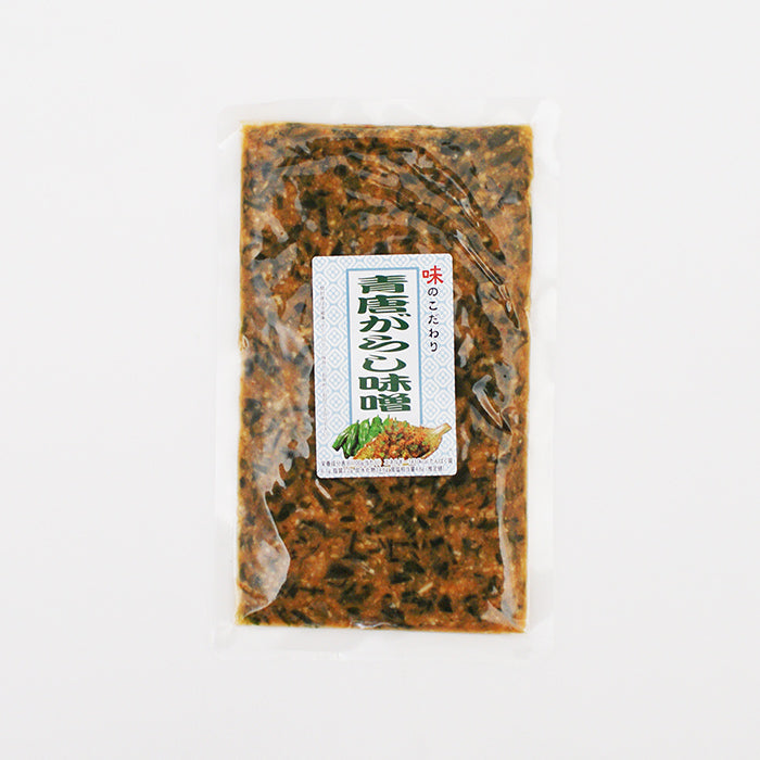 味噌(国内製造)、青唐辛子、砂糖、もろみ、食塩、ごま、寒天、一味唐辛子/ソルビット、調味料(アミノ酸等)、酸味料、甘味料(ステビア)、着色料(カロチノイド、カラメル、銅葉色素)、酸化防止剤(V,C)、酒精、(一部に小麦、大豆、ごま、ゼラチンを含む)