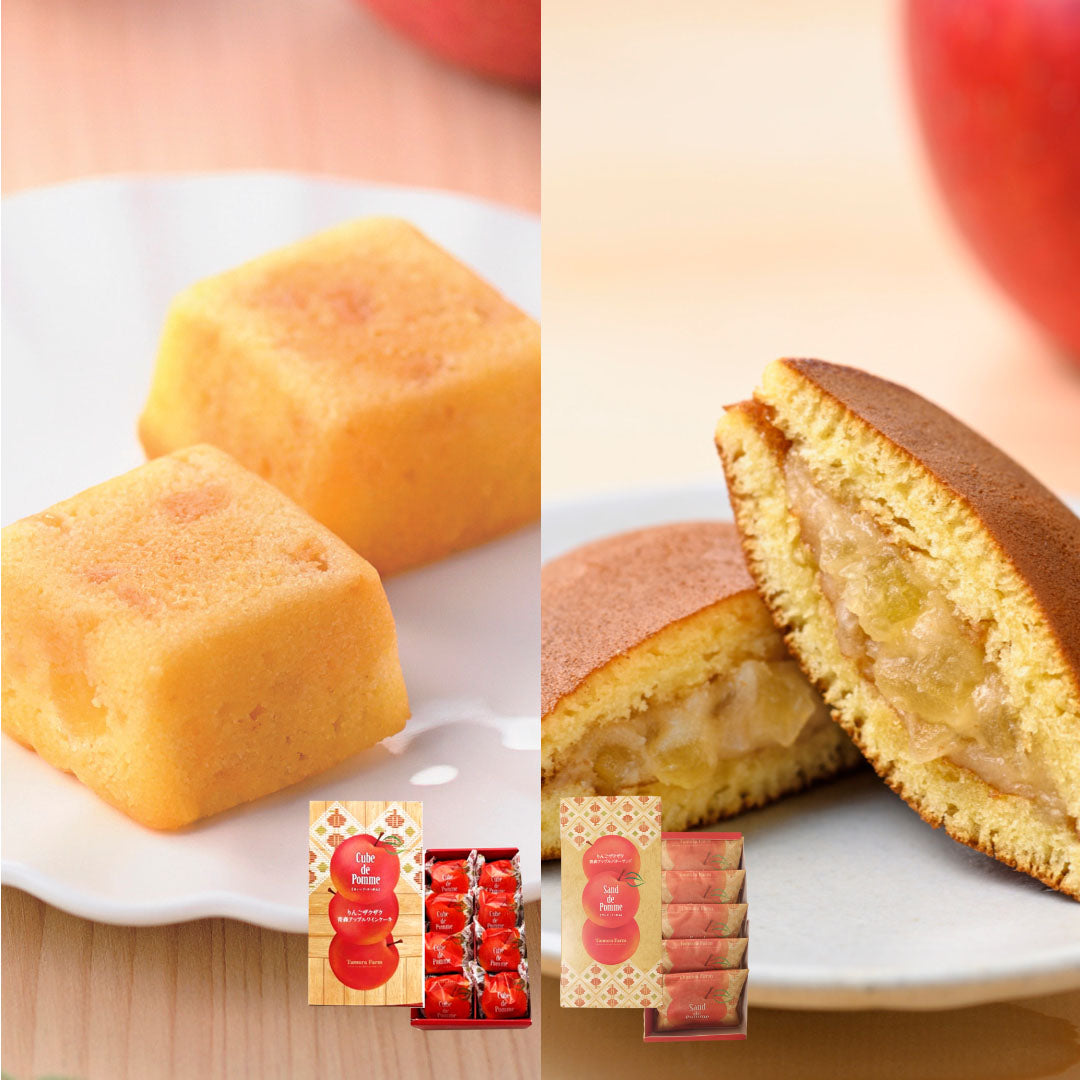 どらやき:りんご蜜漬(りんご、砂糖、水あめ、レモン果汁)(国内製造)、りんごスプレッド(砂糖、麦芽糖、バター、りんご、水あめ)、卵、小麦粉、白こしあん(いんげん豆、砂糖、水あめ、寒天)、砂糖、粉あめ、植物油脂、はちみつ、うるち米、みりん、米あめ、しょうゆ/トレハロース、加工デンプン、糊料(加工デンプン、増粘多糖類)、膨張剤、酸味料、乳化剤、香料、(一部に卵・小麦・乳成分・りんご・大豆を含む)ケーキ:タムラファーム製造りんごプレザーブ(りんご、砂糖、水飴、レモン果汁)マーガリン、小麦粉、液全卵、リキュール、砂糖、タムラファーム醸造アップルワイン、アーモンドパウダー、加藤練乳、食塩、/トレハロース、香料、乳化剤(カラメル、カロテン)(一部に小麦、卵、乳成分、大豆、アーモンド、りんごを含む)