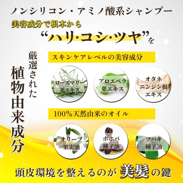 【シャンプー】水、ココイルグルタミン酸TEA、コカミドDEA、コカミドプロピルベタイン、フラーレン、ポリクオタニウム-51、加水分解野菜タンパクPG-プロピルシラントリオール、ヒアルロン酸Na、ローヤルゼリーエキス、ピロクトンオラミン、アロエベラ葉エキス、カッコンエキス、加水分解ケラチン(羊毛)、オリーブ油、ホホバ種子油、ローズマリー油、ヤシ油脂肪酸PEG-7グリセリル、BG、オレイルアルコール、チューベロース多糖体、オタネニンジン根エキス、PVP、エクトイン、オリザノール、ポリクオタニウム-10、水酸化K、クレアチン、クロレラエキス、安息香酸Na、香料、フェノキシエタノール、エタノール【トリ-トメント】水、セテアリルアルコール、セタノール、ベヘントリモニウムクロリド、アモジメチコン、ジメチコン、フラーレン、ポリクオタニウム-51、加水分解野菜タンパクPG-プロピルシラントリオール、ヒアルロン酸Na、ローヤルゼーリーエキス、ピロクトンオラミン、オリザノール、アロエベラ葉エキス、カッコンエキス、クロレラエキス、セラミド3、スクワラン、シア脂、センブリエキス、加水分解コラーゲン、加水分解シルク、トコフェロール、パンテノール、エクトイン、ツバキ油、BG、グリセリン、コカミドプロピルベタイン、乳酸、乳酸Na、PVP、香、フェノキシエタノール、エタノール