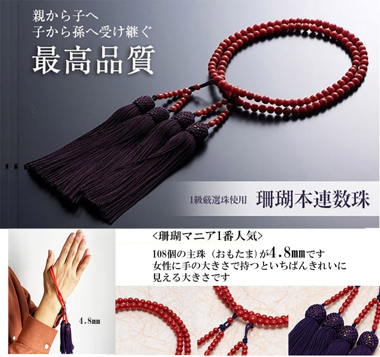 赤サンゴ本連数珠1本 桐箱1個 数珠袋1個 高知県珊瑚協同組合保証書1通