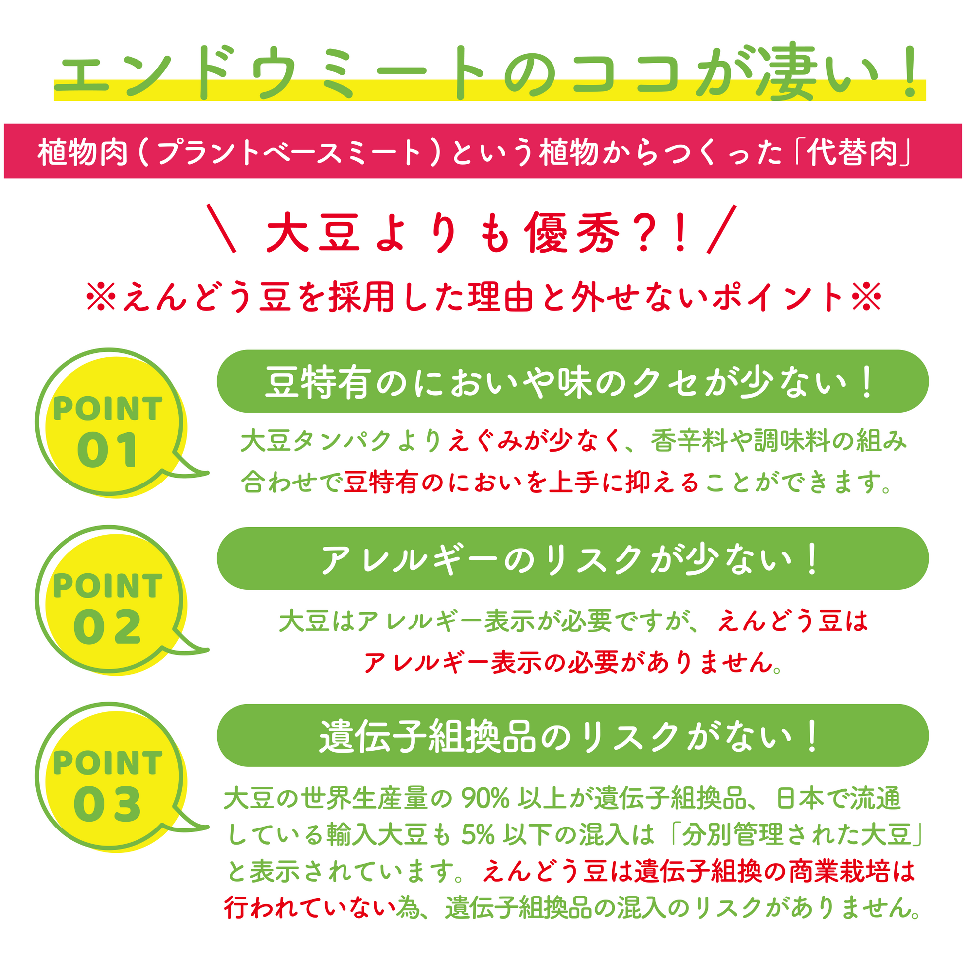 大豆の世界生産量の90%以上が遺伝子組換品で、日本で流通している輸入大豆も5%以下の混入であれば「分別管理された大豆」と表示されています。一方、エンドウは遺伝子組換品の商業栽培がおこなわれていない作物であり、遺伝子組換品の混入リスクがありません。