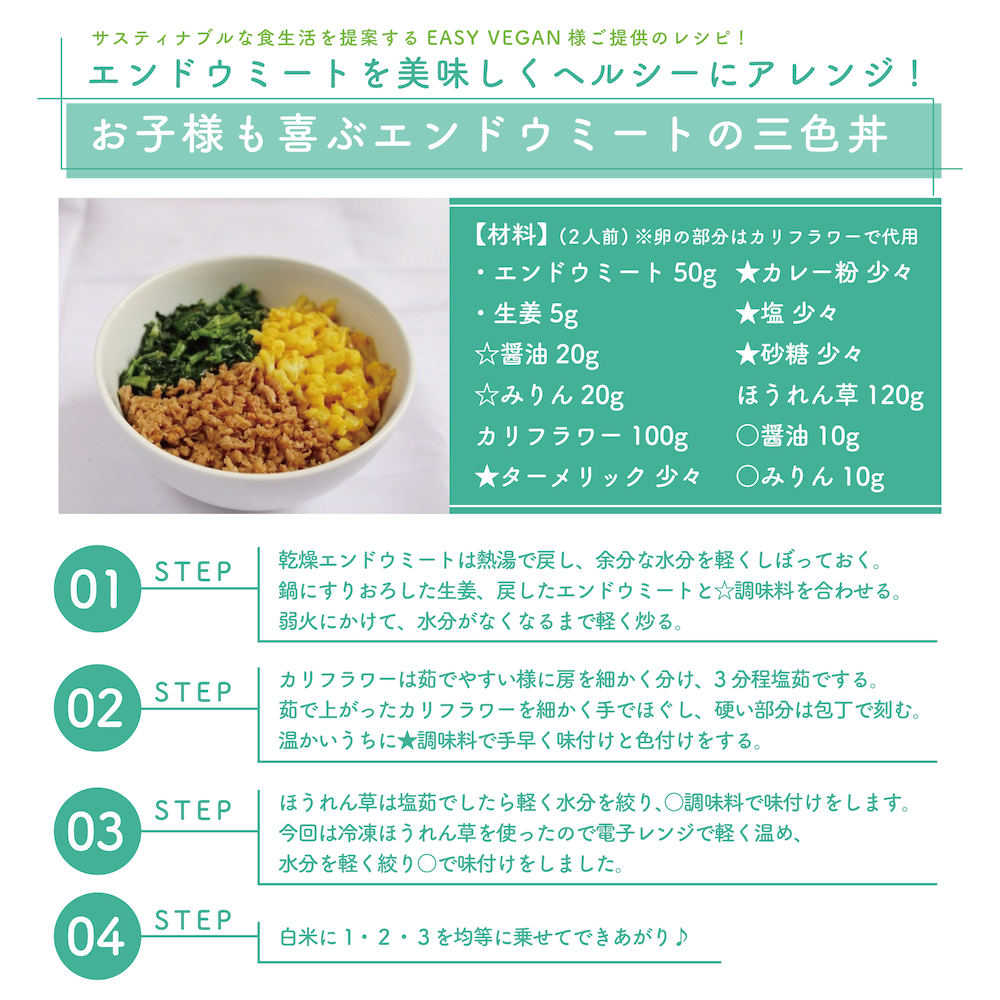 大豆と比べエンドウは豆臭さがなく豆独特の味のクセがすくないから調理しやすい具体的には、大豆タンパクよりもえぐみが少ないです。豆独特のにおいも、香辛料や調味料の組み合わせで上手に抑えることができます。