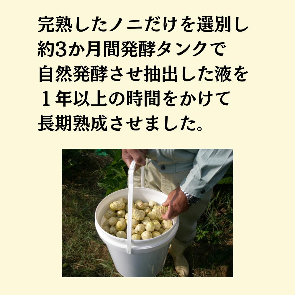 完熟したノニの実だけを選別し、約3か月間発酵タンクで自然発酵させ抽出した液を、1年以上の時間をかけて長期熟成させています。