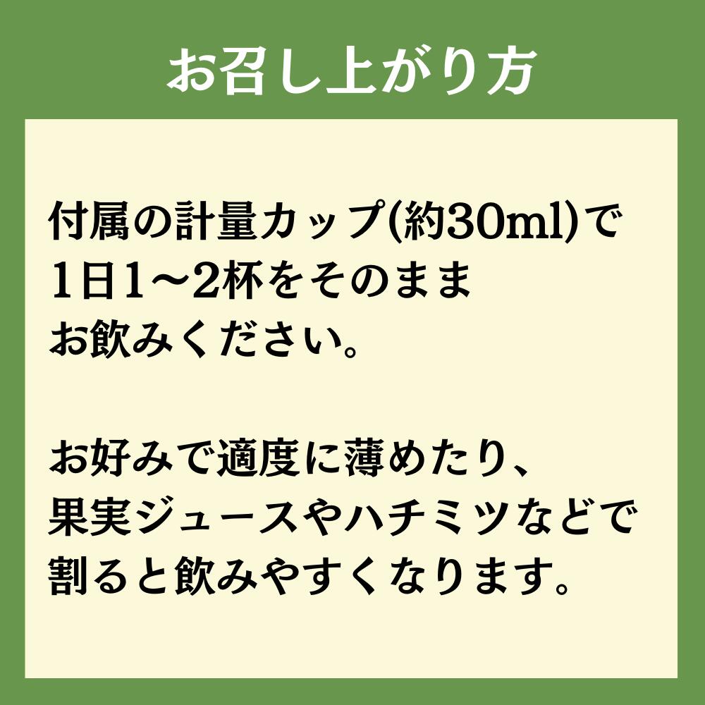 付属の計量カップ(約30ml)で、1日1~2杯をそのままお飲みください。