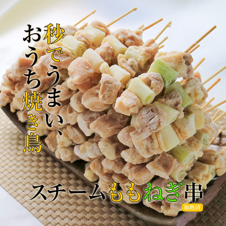 スチーム加熱済み ももねぎ串(ねぎま/ねぎ間/ネギま) の説明・肉のおつまみ専門店ミート21ショップの肉系おつまみ、スチーム加熱済み 冷凍 もも串(鳥もも串/もも身) の焼き鳥(やきとり/焼鳥/ヤキトリ)です。・すでにスチームされているため、未加熱、生焼け(食中毒)のリスクがなく、焼き上げに高度な技術が必要ありません。