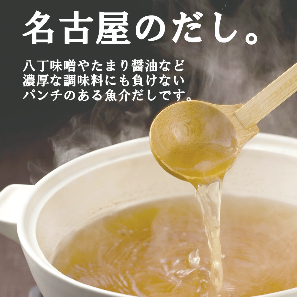 東海地方で好まれるさば、むろあじ、宗田鰹を厳選。味噌汁にも合うようにかたくちいわしもブレンドした魚介だし。だし素材以外には何も加えていません。