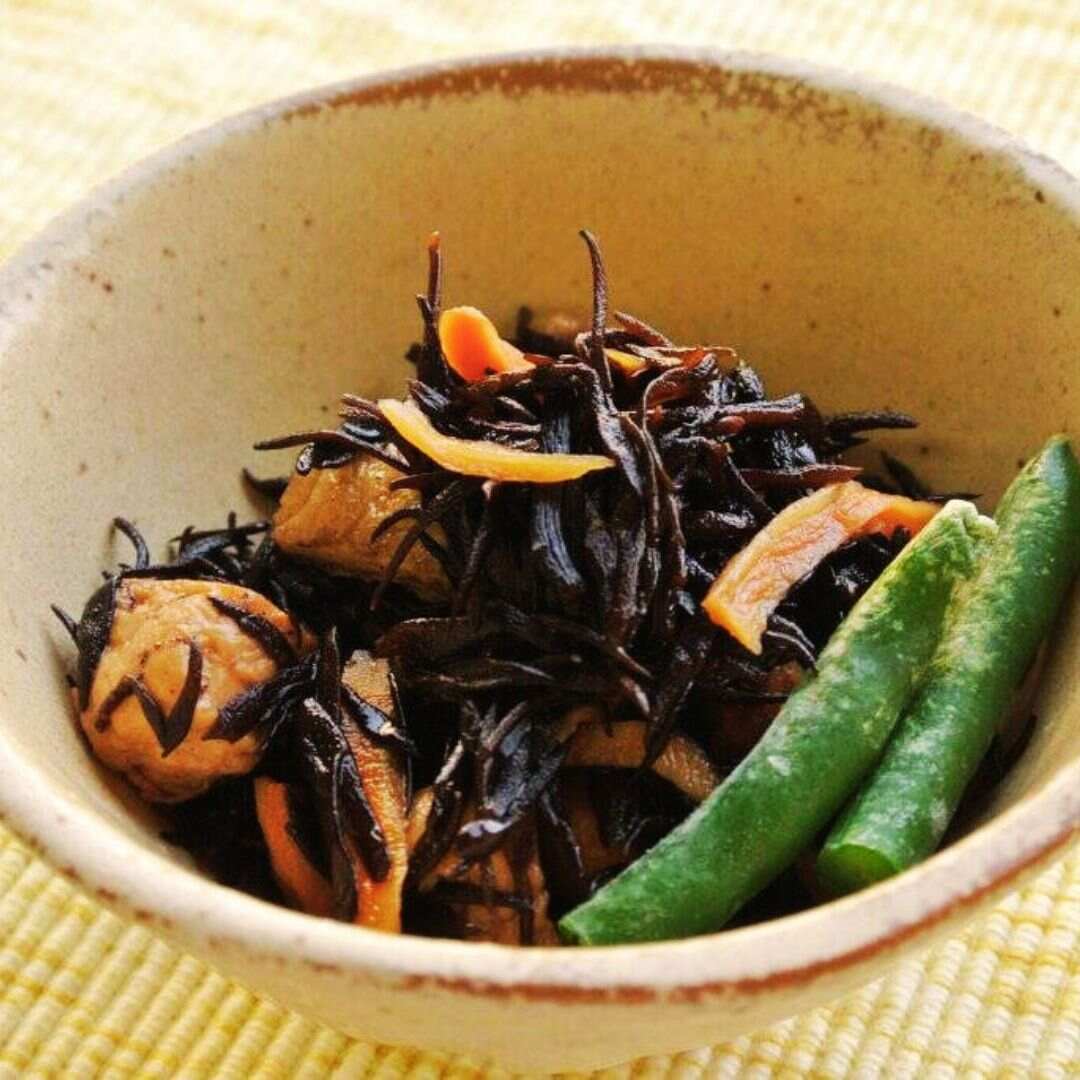 ひじきが戻ったらざるに上げ、軽く水洗いしてよく水気を切り、ご使用ください。