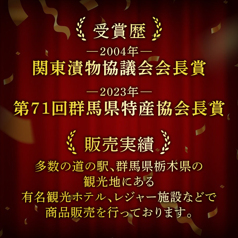 ハヤト瓜、茄子、しゃくし菜、茗荷、菊の花、胡瓜、大根、茄子、人参、生姜、味噌、白醤油、漬け件材料(黒糖、砂糖、食塩、醤油、唐辛子、果糖、醸造酢、タンパク加水分解物)、ソルビット、調味料(アミノ酸等)、甘味料(ステビア)、酸味料、香料、保存料(ソルビン酸)、漂白剤(次亜硫酸Na)、酸化防止剤VC、酒精、増粘多糖類、着色料(クチナシ)カラメル色素、(原材料の一部に小麦、大豆を含む)