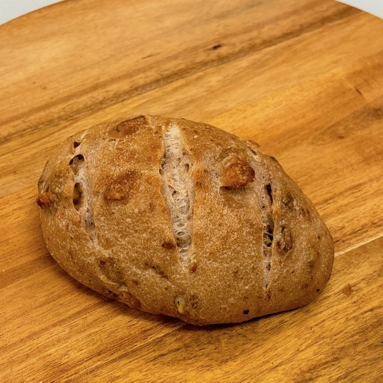 国産小麦春よこいに全粒粉も配合し、食物繊維、ミネラルたっぷりのくるみパン。トーストするとさらに香ばしくお召しがりいただけます。
