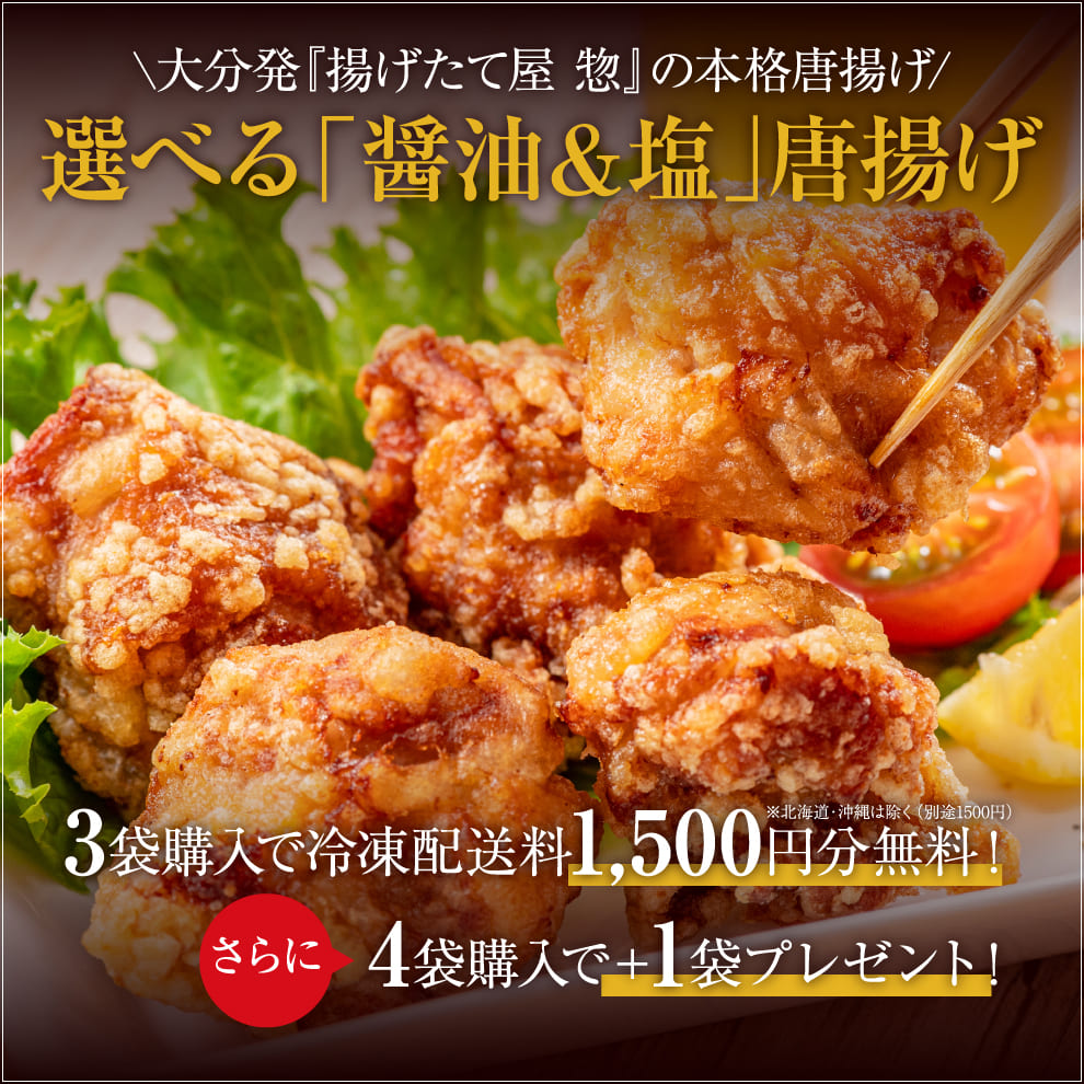 本場大分の唐揚げ専門店「揚げたて屋 惣」の秘伝の味を、お好みに合わせて「醤油唐揚げ」「塩唐揚げ」から選べる本格唐揚げとしてご用意しました。