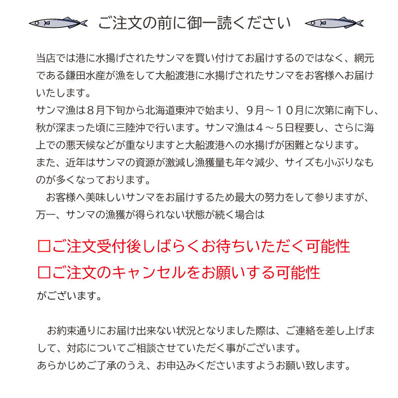 お客様へ美味しいさんまをお届けするために最大の努力をして参りますが、万が一さんまの漁獲が得られない状態が続く場合には≪ご注文受付後、しばらくお待ちいただく可能性≫、≪ご注文のキャンセルをお願いする可能性≫、≪総重量分でお送りする可能性≫がございます。