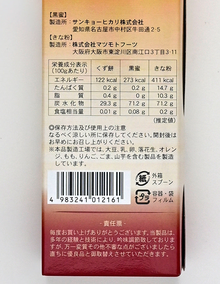 内容量/くず餅75g・黒蜜5g・きな粉5g×各3個