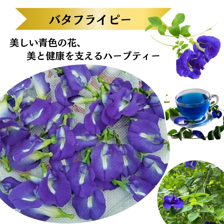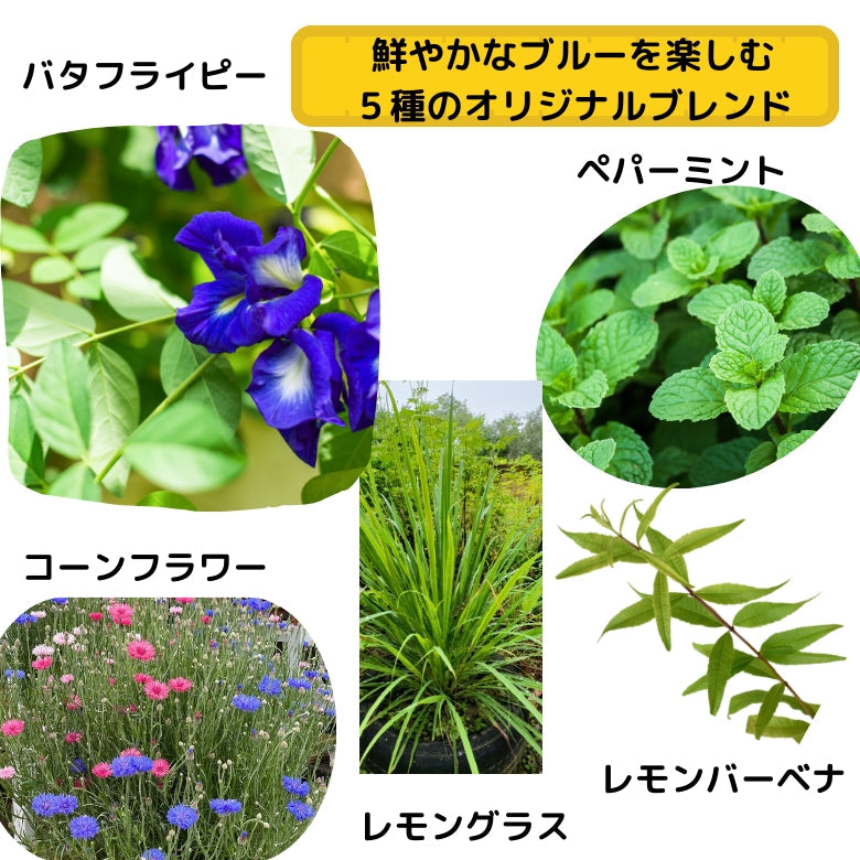 バタフライピーフラワー&リーフ、コーンフラワー、レモングラス、ペパーミント、レモンバーベナ