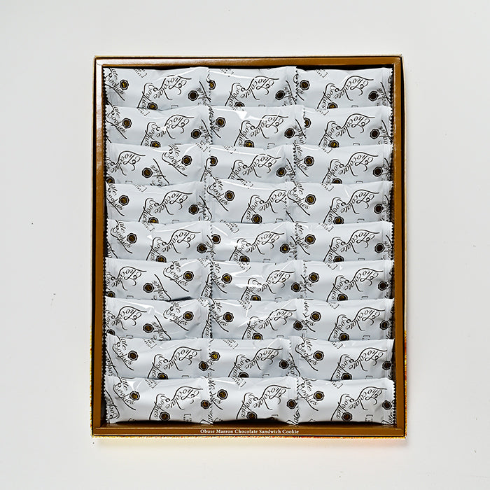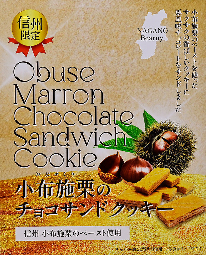 小布施栗のペーストを使ったサクサクの香ばしいクッキーに栗風味チョコレートをサンドしました。