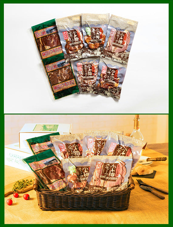 味付ラム2個(1個250g)、鶏砂肝スモーク(120g)、トントロスモーク(110g)、ナンコツスモーク(130g)、牛バラスモーク(100g)、豚サガリスモーク(120g)