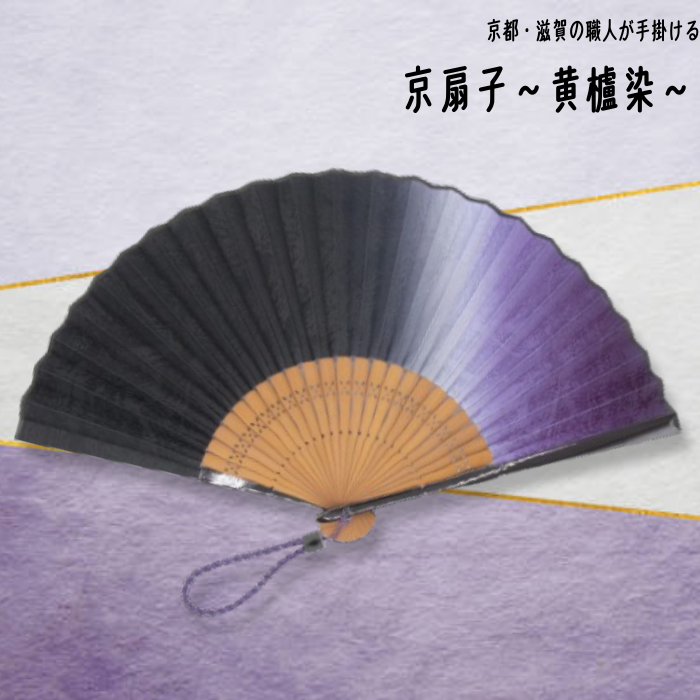 着物に使われる地模様が織り込まれた正絹生地に、黄櫨染のぼかしが神秘的で美しい京扇子。