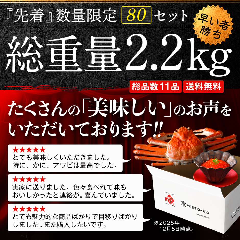 | 商品内容 | 【\総重量2.2kg/ 海鮮11点福袋 】 【限定80セット】中身は届いてからのお楽しみです。 |