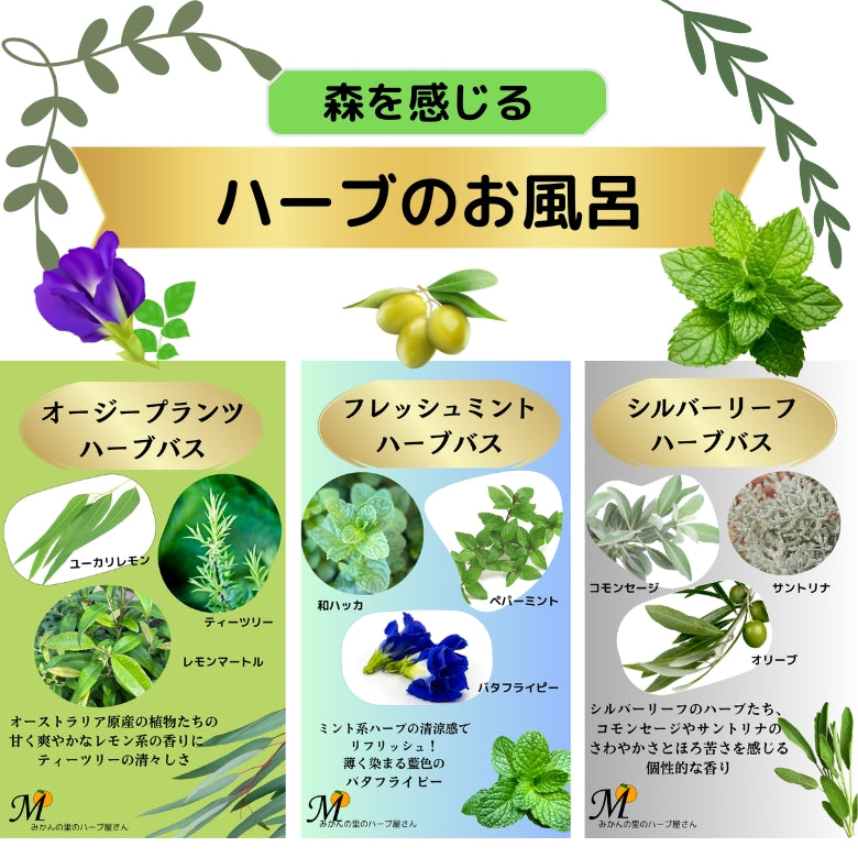 (ユーカリレモン、ティーツリー、レモンマートル、ユーカリレモンEO、ティーツリーEO)(和ハッカ、ペパーミント、バタフライピー、スペアミントEO)(コモンセージ、サントリナ、オリーブ、クラリーセージEO)