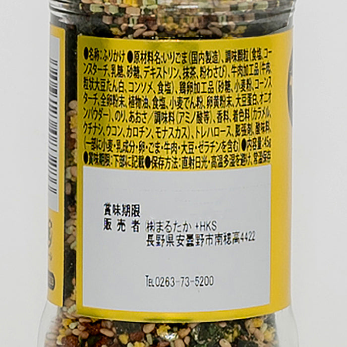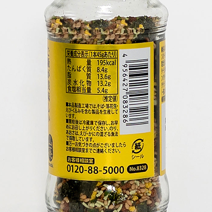 原材料/いりごま(国内製造)、調味顆粒(食塩、コーンスターチ、乳糖、砂糖、デキストリン、抹茶、粉わさび)、牛肉加工品(牛肉、粒状大豆たん白、コンソメ、食塩)、鶏卵加工品(砂糖、小麦粉、コーンスターチ、全卵粉末、植物油、食塩、小麦でん粉、卵黄粉末、大豆蛋白、オニオンパウダー)、のり、あおさ/調味料(アミノ酸等)、香料、着色料(カラメル、クチナシ、ウコン、カロチン、モナスカス)、トレハロース、膨張剤、酸味料、(一部に小麦、乳成分、卵、ごま、牛肉、大豆、ゼラチンを含む)