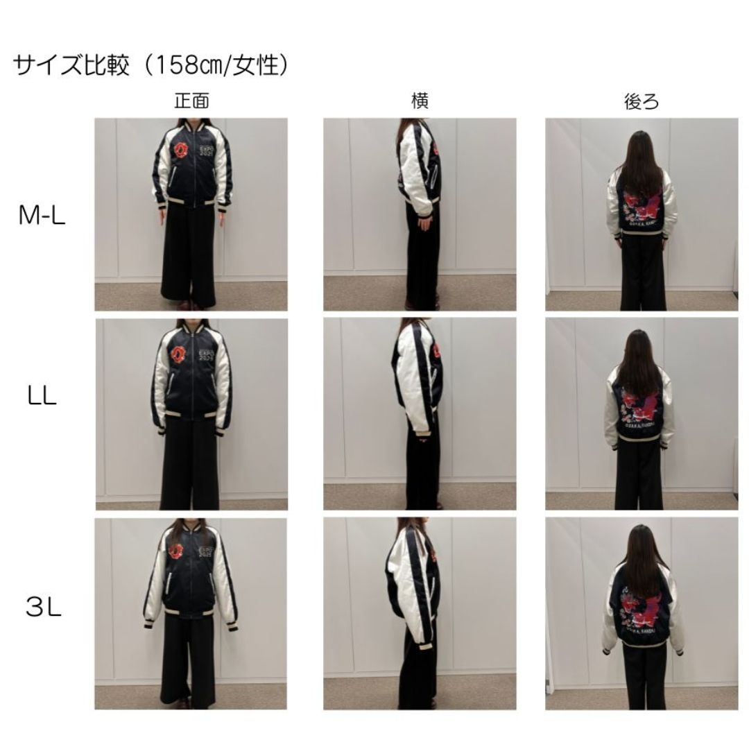 M-Lサイズ 幅:56cm,長さ:60cm,袖丈: 86cm / LLサイズ 幅:58cm,長さ:64cm,袖丈: 90cm / 3Lサイズ 幅:63cm,長さ:68cm,袖丈: 92cm