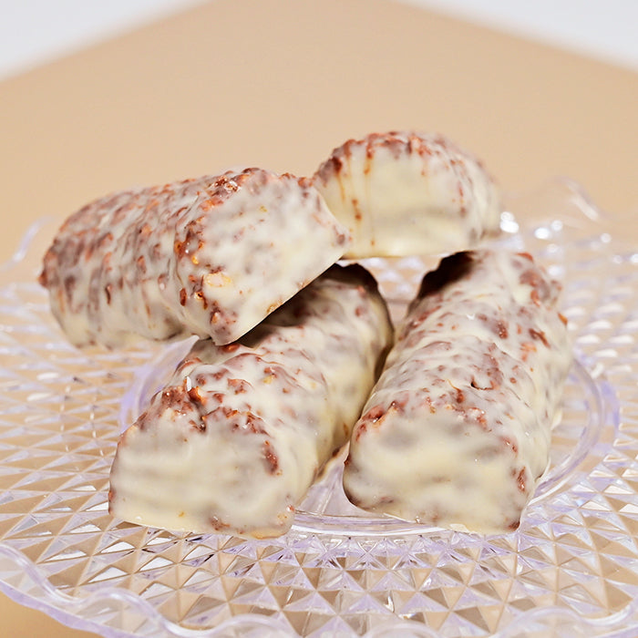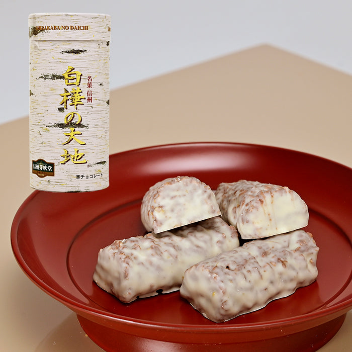 「白樺の大地」はミルクチョコレートにゴーフレットクラムをちりばめ、ホワイトチョコレートでコーティングしたチョコレート菓子。信州白樺の木をイメージして作ったお菓子です。