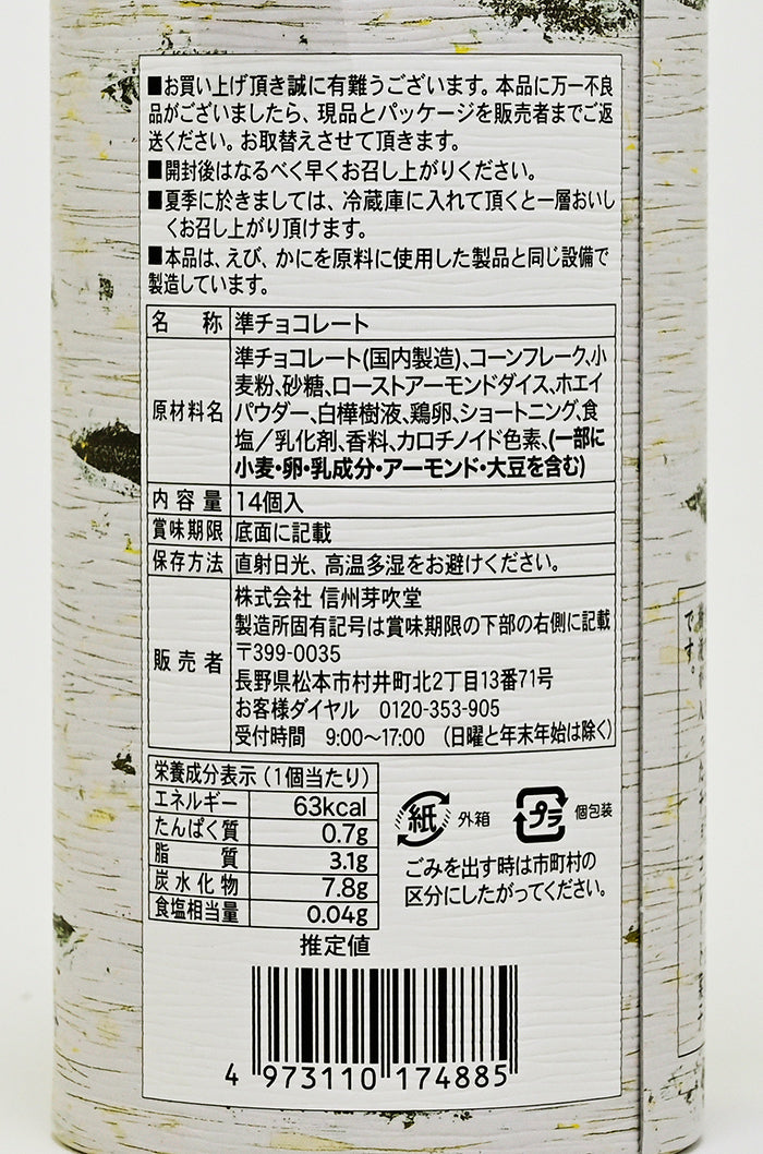 原材料/準チョコレート(国内製造)、コーンフレーク、小麦粉、砂糖、ローストアーモンドダイス、ホエイパウダー、白樺樹液、鶏卵、ショートニング、食塩/乳化剤、香料、カロチノイド色素、(一部に小麦、卵、乳成分、アーモンド、大豆を含む)