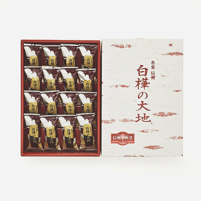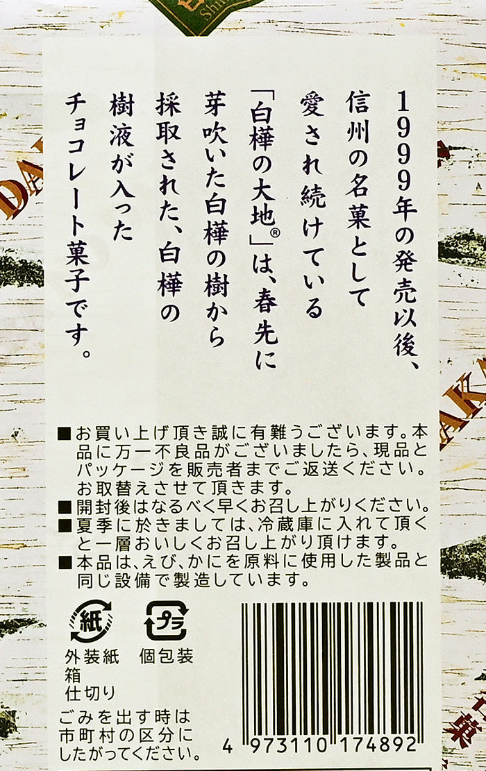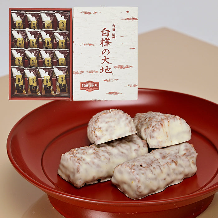 「白樺の大地」はミルクチョコレートにゴーフレットクラムをちりばめ、ホワイトチョコレートでコーティングしたチョコレート菓子。信州白樺の木をイメージして作ったお菓子です。