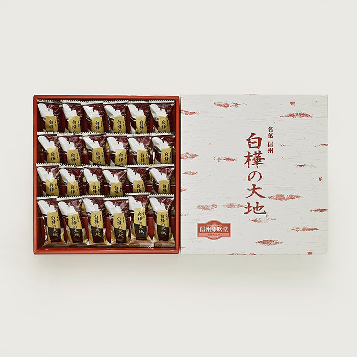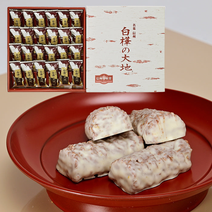 「白樺の大地」はミルクチョコレートにゴーフレットクラムをちりばめ、ホワイトチョコレートでコーティングしたチョコレート菓子。信州白樺の木をイメージして作ったお菓子です。
