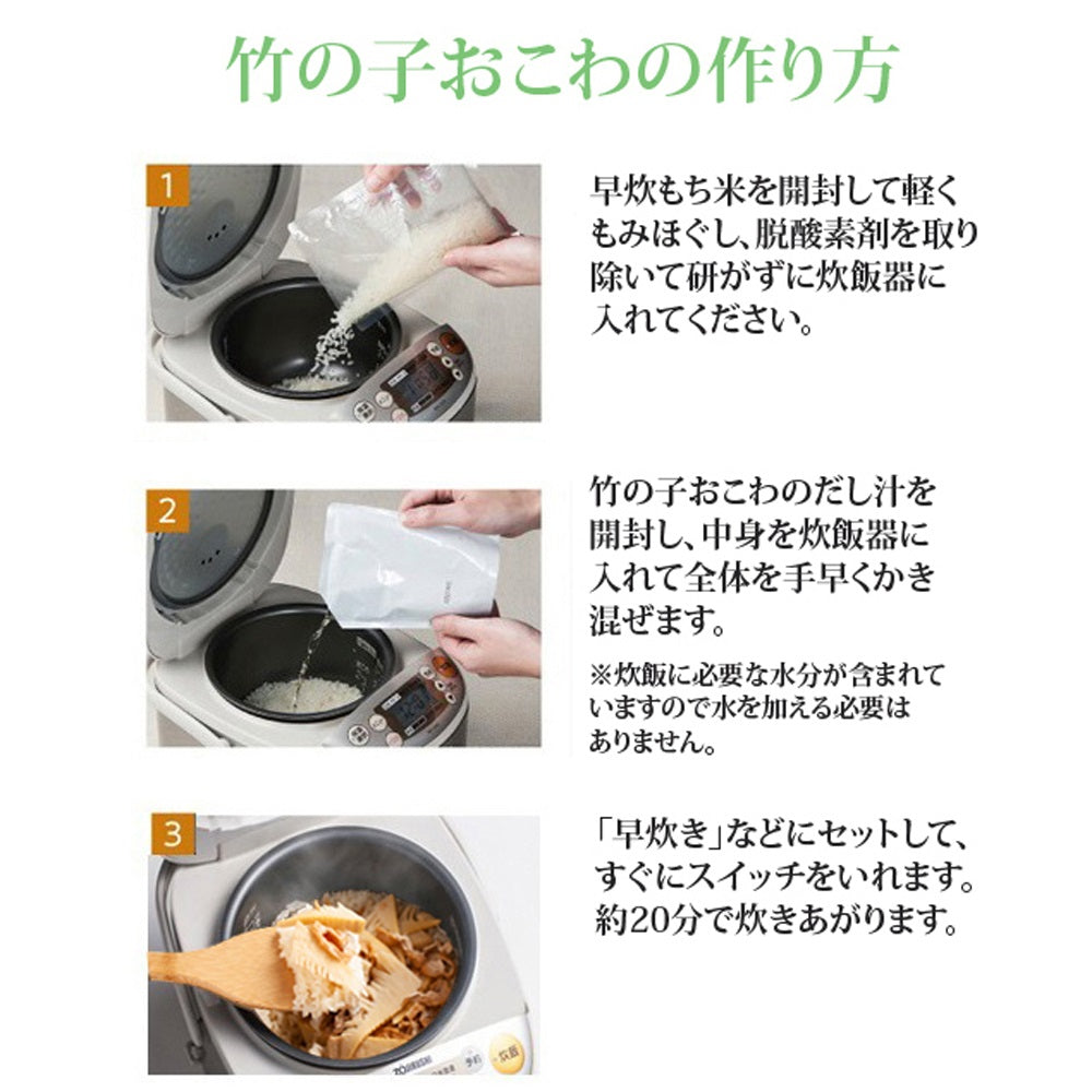 お米を研いだり水を加える手間はありません。水加減を調整済みなのでおこわでありながら炊飯器でもっちりホカホカに出来上がります。