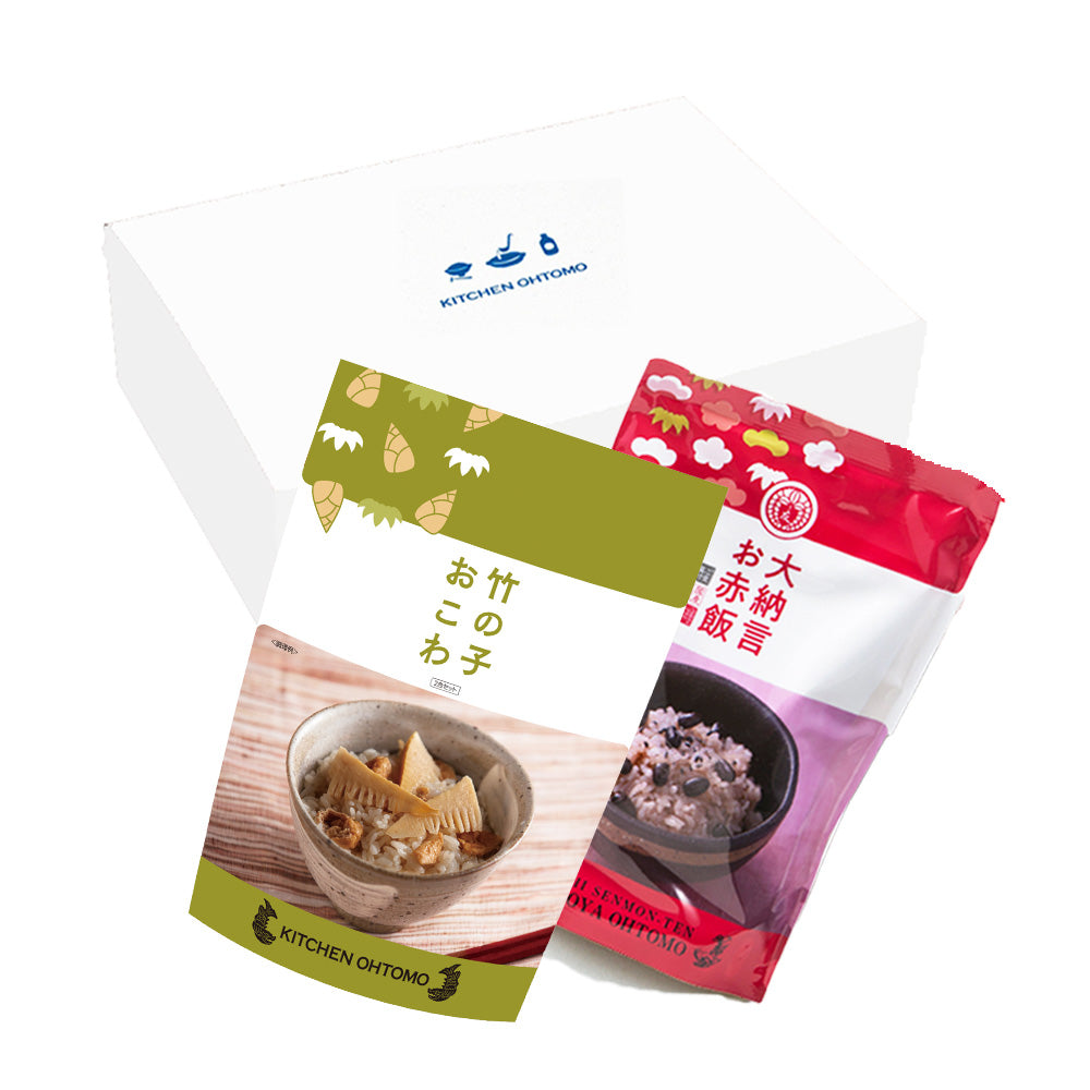 竹の子おこわ:原材料:加工米(もち米(国産))、竹の子入だし汁(たけのこ(国産)、かつお節だし、油揚げ(国産)、醸造調味料、しょうゆ、食塩)、(一部に小麦・大豆を含む)大納言お赤飯原材料名:加工米(もち米(国産))、小豆煮汁(小豆煮汁、還元水あめ、食塩)、小豆(大納言小豆(国産))、ごま塩(食塩、黒ごま)、(一部にごまを含む)