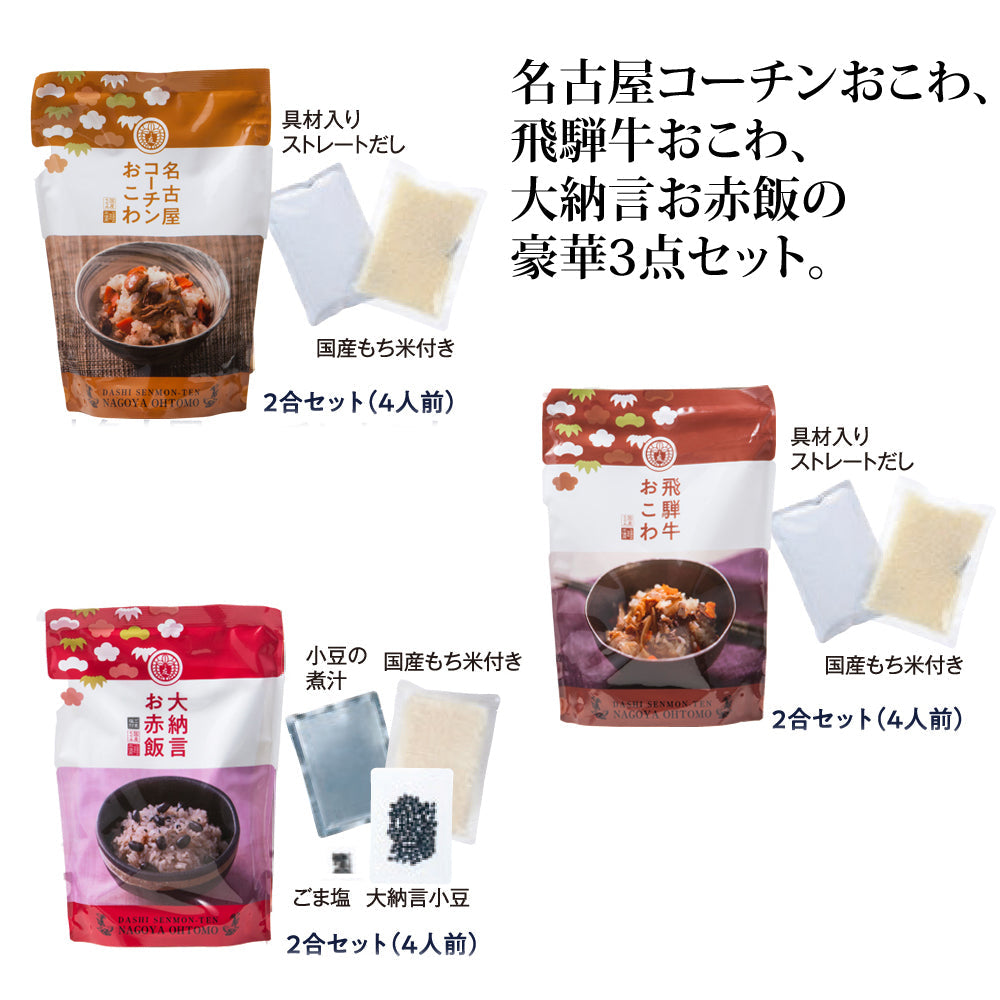 内容:大納言お赤飯2合セット×1、名古屋コーチンおこわ2合セット×1、飛騨牛おこわ2合セット×1