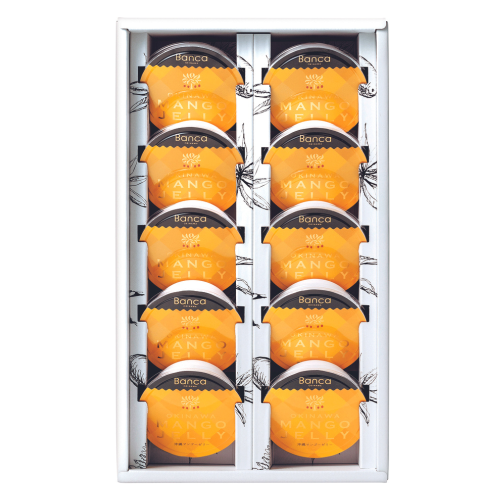 ゼリー:マンゴー(沖縄県産)、砂糖、パッションフルーツ、脱脂加糖練乳、レモン果汁、 洋酒、ゲル化剤(増粘多糖類)、酸化防止剤(ビタミンC)、酸味料(クエン酸)、香料