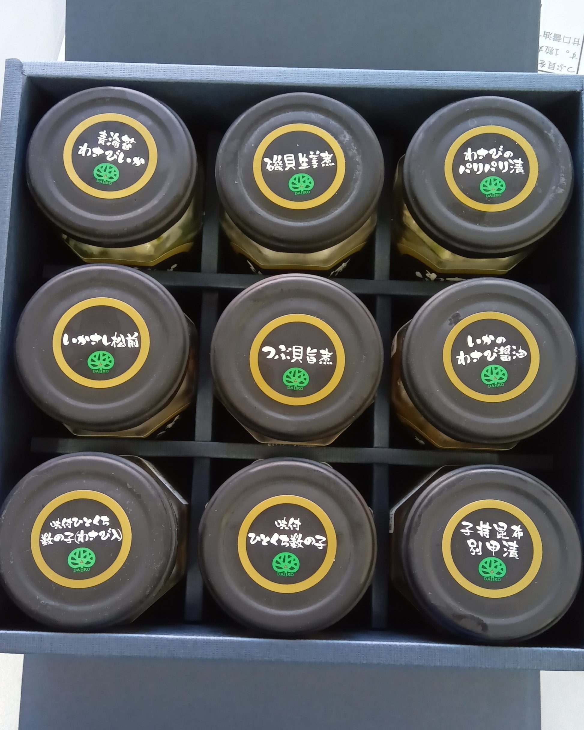 【わさびのパリパリ漬】・・・切干大根(国内製造)、魚卵、わさび茎、醤油加工品(砂糖、白しょうゆ、食塩、アミノ酸液、醸造酢、かつお節エキス)、味醂/調味料(アミノ酸等)、香料、(一部に小麦・大豆を含む):【青海苔わさびいか】・・・魚介類加工品(いか(マレーシア)、食塩)、わさび茎、?油加工品(砂糖、醤油、食塩、アミノ酸液、醸造酢、かつお節エキス)、ひとえぐさ/調味料(アミノ酸等)、(一部に小麦・いか・大豆を含む):【いかさし松前】・・・魚介類加工品(いか(マレーシア)、食塩)、昆布、味醂、人参、水あめ、こいくちしょうゆ(本醸造)、砂糖、食塩/調味料(アミノ酸等)、ソルビット、酒精、酸味料、(一部に小麦・いか・大豆を含む):【味付けひとくち数の子】・・・数の子(アメリカ)、醤油加工品(砂糖、白しょうゆ、食塩、アミノ酸液、醸造酢、かつお節エキス)/調味料(アミノ酸等)、ビタミンB1、(一部に小麦・大豆を含む):【味付けひとくち数の子(わさび入)】・・・数の子(アメリカ)、醤油加工品(砂糖、白しょうゆ、食塩、アミノ酸液、醸造酢、かつお節エキス)、わさび茎/調味料(アミノ酸等)、香料、ビタミンB1、(一部に小麦・大豆を含む):【つぶ貝旨煮】・・・つぶ貝(カナダ)、こいくちしょうゆ、みりん、しょうゆ加工品(砂糖、しろしょうゆ、食塩、その他)、清酒、砂糖/調味料(アミノ酸等)、ビタミンB1、(一部に小麦・大豆を含む):【磯貝生姜煮】・・・トップシェル(ブルカリア)、醤油加工品(砂糖、白しょうゆ、食塩、アミノ酸液、醸造酢、かつお節エキス)、生姜/調味料(アミノ酸等)、ビタミンB1、(一部に小麦・大豆を含む):【いかのわさび?油】・・・魚介類加工品(いか(マレーシア)、食塩)、わさび茎、こいくちしょうゆ(本醸造)、みりん、醤油加工品(砂糖、白しょうゆ、食塩、アミノ酸液、醸造酢、かつお節エキス)、合成清酒、砂糖/調味料(アミノ酸等)、ソルビット、酒精、酸味料、(一部に小麦・いか・大豆を含む):【子持昆布別甲漬】・・・子持昆布(アメリカ、カナダ)、味醂、醤油、砂糖、食塩/調味料(アミノ酸等)、(一部に小麦・大豆を含む)