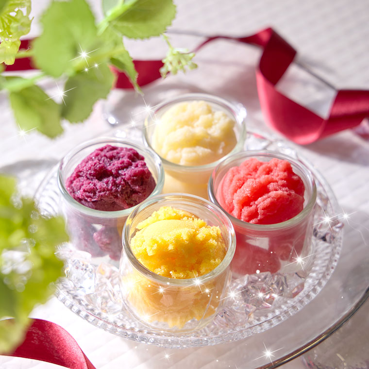 食べる前に約10分少し解凍していただくと、みずみずしく、フルーティーなソルベをお楽しみいただけます。