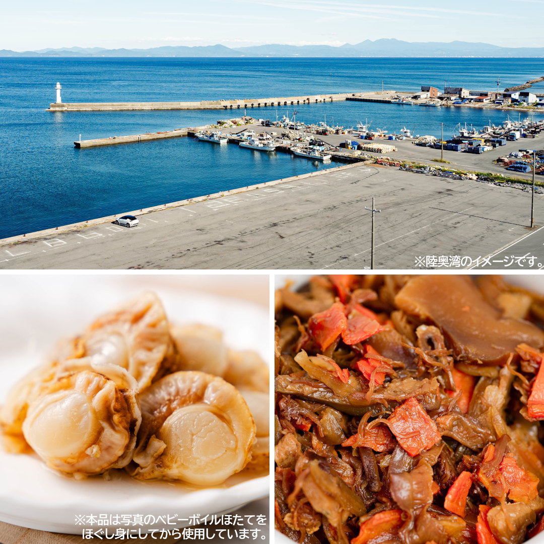 ほたてむき身(青森製造)、醤油、発酵調味液、ごぼう、人参、合成清酒、乾しいたけ、油揚げ、砂糖、風味調味料、食塩/調味料(アミノ酸等)、保存料(ソルビン酸K)、凝固剤、酸味料、(一部に小麦・大豆を含む)