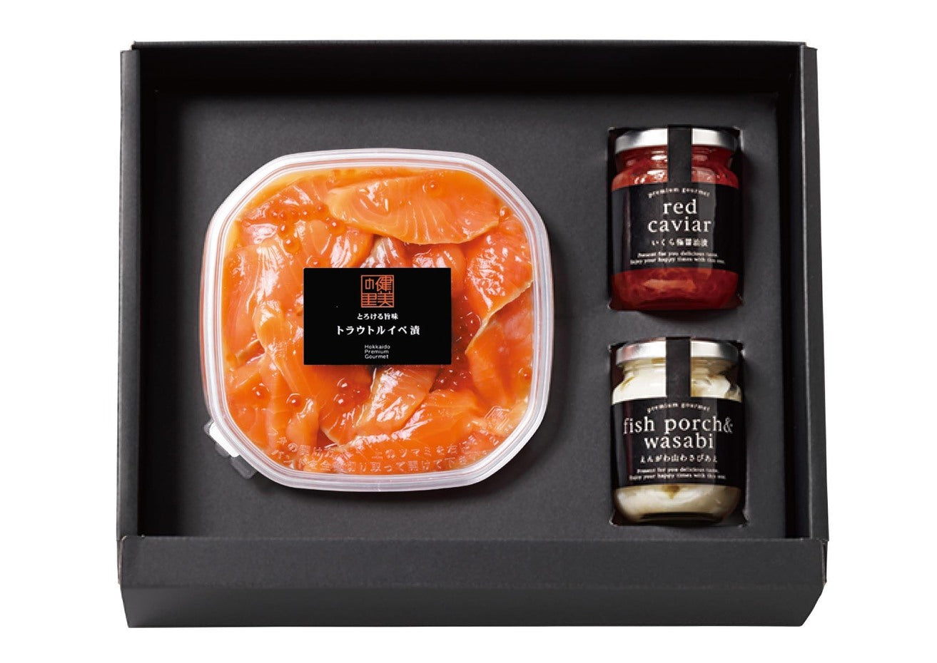 トラウトサーモンルイベ漬200g・いくら極醬油漬80gえんがわ山わさびあえ80g×各1