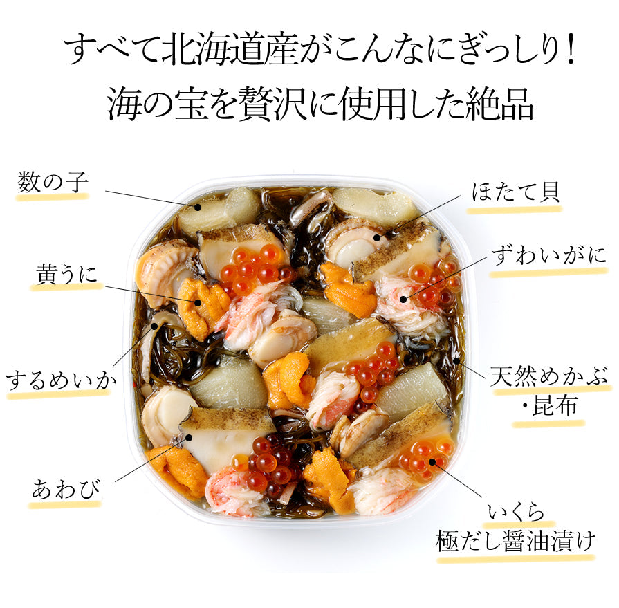 原材料名:真昆布、長昆布、厚葉昆布、がごめ昆布、ねこあし昆布(昆布はすべて北海道産)、めかぶ(北海道産)、いか(北海道産)、ほたて(北海道産)、数の子(北海道産)、うに(北海道産)、いくら(北海道産)、あわび(北海道産)、ずわいがに(北海道産)、唐辛子、味醂、醤油、砂糖/ソルビット、調味料(アミノ酸等)、増粘多糖類、保存料(ソルビン酸K)、酒精、(一部に小麦・かに・いくら・あわび・いか・大豆を含む)、栄養成分表示(100g当たり推定値)エネルギー176kcal、たんぱく質7.3g、脂質0.3g、炭水化物36.5g、食塩相当量4.2g