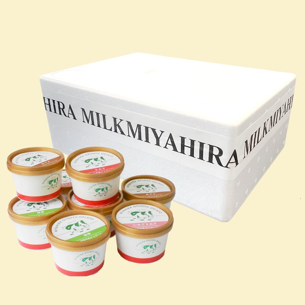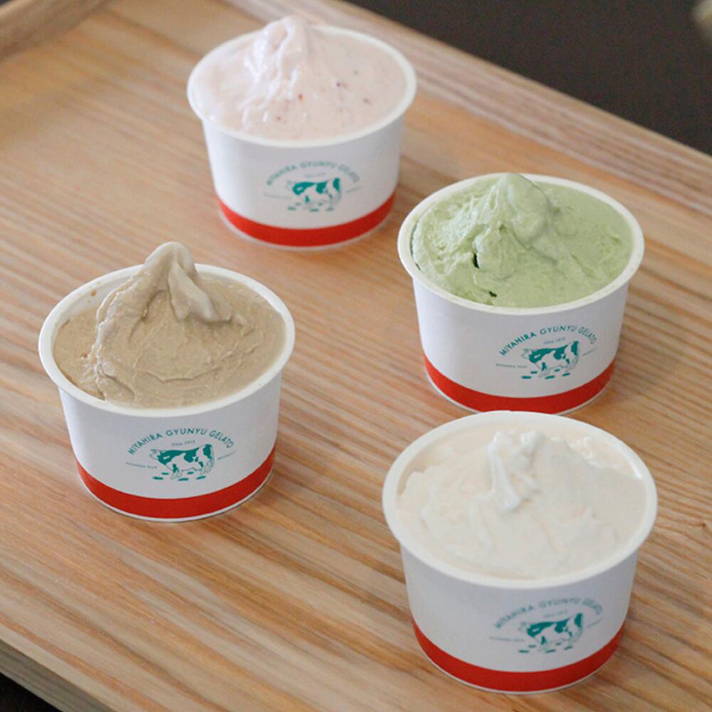 ミルク : 無脂乳固形分9.6%、乳脂肪分5%、牛乳、ジェラートミックス粉(グラニュー糖、黒砂糖、脱脂粉乳、ブドウ糖)クリーム、乳化剤、安定剤(増粘多糖類) カフェオレ : 無脂乳固形分10.4%、乳脂肪分5.2%、植物脂分0.5%、牛乳、ジェラートミックス粉(グラニュー糖、黒砂糖、脱脂粉乳、ブドウ糖)クリーム、インスタントコーヒー、植物油脂、コーヒー豆/トレハロース、乳化剤、安定剤(増粘多糖類) 抹茶 : 無脂乳固形分10.4%、乳脂肪分5%、牛乳、ジェラートミックス粉(グラニュー糖、黒砂糖、脱脂粉乳、ブドウ糖)クリーム、抹茶/トレハロース、乳化剤、安定剤(増粘多糖類) いちご : 無脂乳固形分9.6%、乳脂肪分9.2%、牛乳、ジェラートミックス粉(グラニュー糖、黒砂糖、脱脂粉乳、ブドウ糖)、クリーム、冷凍いちご、クリームチーズ/トレハロース、乳化剤、安定剤(増粘多糖類)