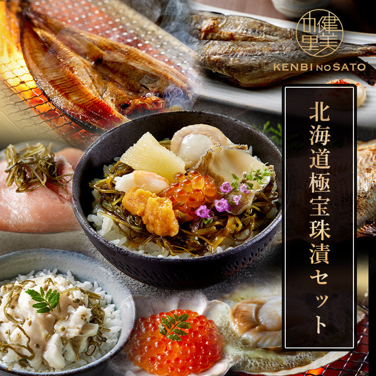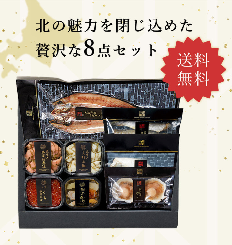 真ほっけ【羅臼産】×1、こまい【北海道産】3尾入×1、宗八かれい【北海道産】×1、ほたて片貝【北海道産】2枚入×1、極宝珠漬50g×1、昆布〆塩蔵新巻鮭50g×1、昆布〆真鱈山椒50g×1、いくら極油漬50g×1