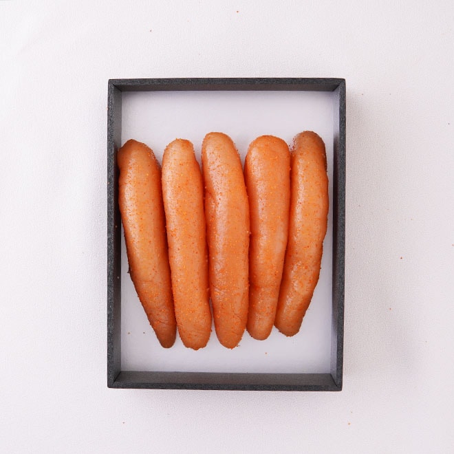 すけとうだらの卵巣(米国産)、純米酒、酒みりん、醤油、鰹節、昆布、食塩、唐辛子 調味料(アミノ酸等)、酸化防止剤(V.C)、pH調整剤、トレハロース、ナイアシン、甘味料(甘草、ステビア)、発色剤(亜硝酸Na) (一部に大豆・小麦を含む)