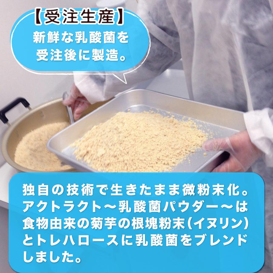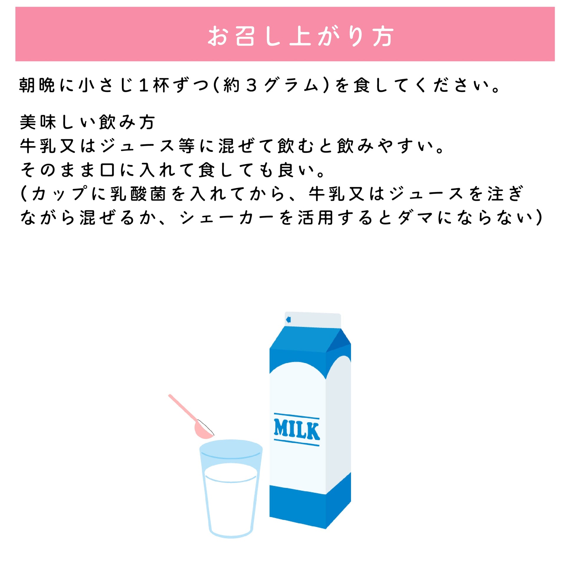 アクトラクト「活性乳酸菌」は、熱に強く、酸性環境(胃酸耐性・胆汁耐性)にも耐えうることができます。腸内革命を起こす!腸内から、健康に免疫力を高めるために。腸というのは、身体中の免疫細胞が半分以上集まる場所と言われています。その場所に、乳酸菌などの、善玉菌を増やして整えることで、免疫細胞もより、活発に動く様になります。朝晩に小さじ1杯ずつ(約3グラム)を食してください。