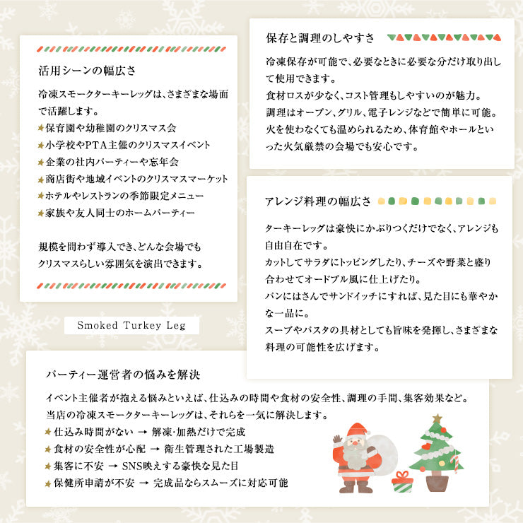 冷凍スモークターキーレッグは、クリスマスらしい非日常感と写真映えをひと皿で叶えるパーティーの主役。仕込み不要で運営効率を高めつつ、参加者の満足度とSNS拡散を同時に狙えます。企画者の「準備をラクに」「雰囲気は最大に」を支える強力アイテムとして、ぜひご活用ください。