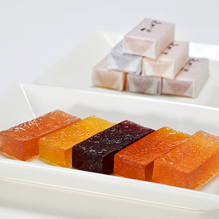 果実(ぶどう、みかん、桃、りんご、杏)、水飴(国内製造)、グラニュー糖、寒天、オブラート(澱粉)、(一部にもも・りんご・大豆を含む)
